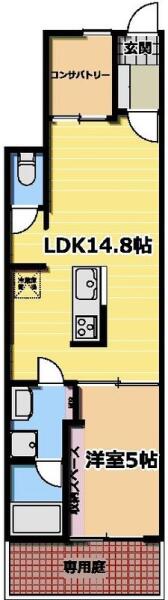 | 設備・条件 | 1階の物件 , ペット相談 , 2人入居可 , 保証人不要 , システムキッチン , ガスコンロ , コンロ二口以上 , カウンターキッチン , バス・トイレ別 , 追い焚き , シャワートイレ , 浴室乾燥機 , エアコン , 光ファイバー , オートロック , TVドアホン , 室内洗濯機置場 , フローリング , 専用庭 , 駐輪場あり , 都市ガス | ||